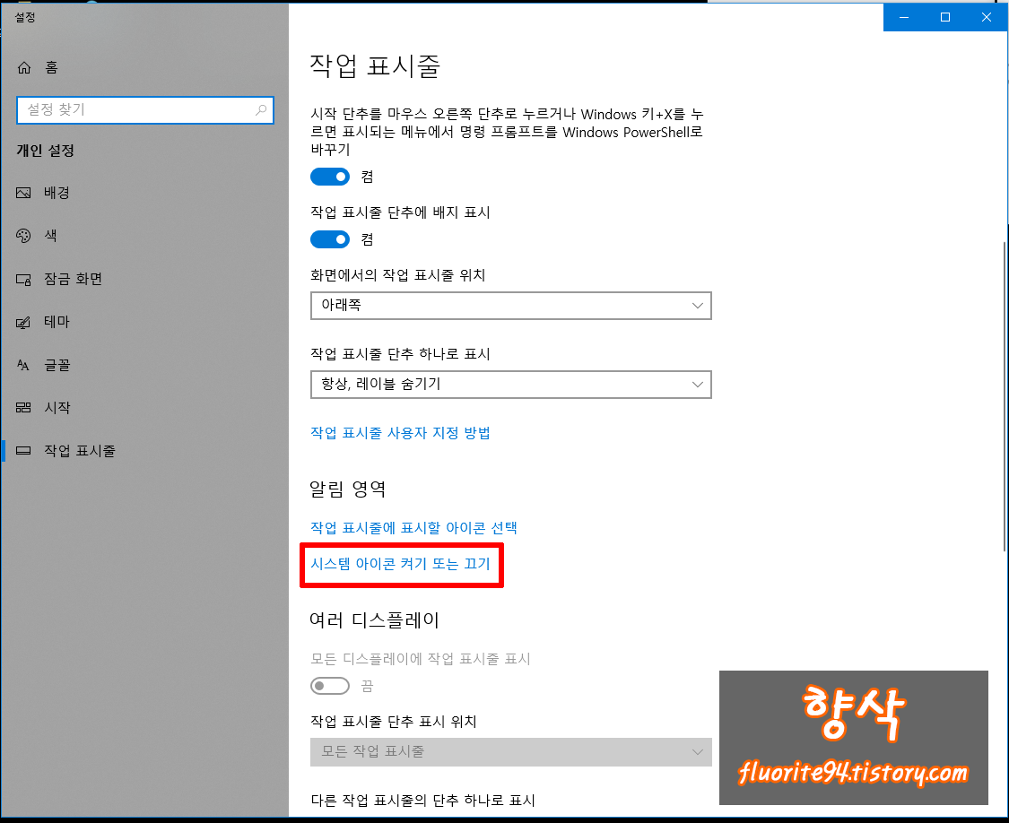 작업표시줄 설정에서 알림 영역에 [시스템 아이콘 켜기 또는 끄기]에 들어갑니다.