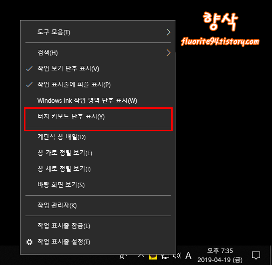 1. 작업표시줄을 우클릭하여 [터치 키보드 단추 표시]를 클릭하여 활성화시킵니다.