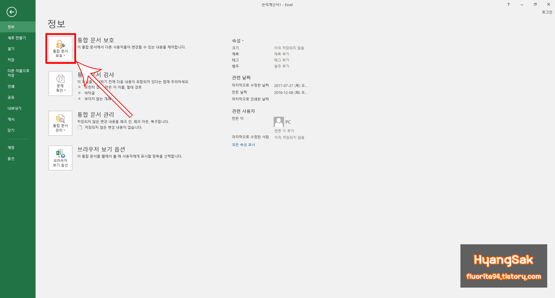 파일을 클릭하면 정보 탭에 통합 문서 보호라는 기능이 있습니다.