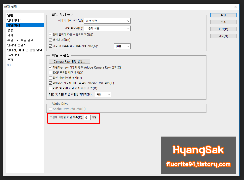 상단 메뉴에서 [파일 - 환경설정 - 파일 처리]에 들어갑니다.