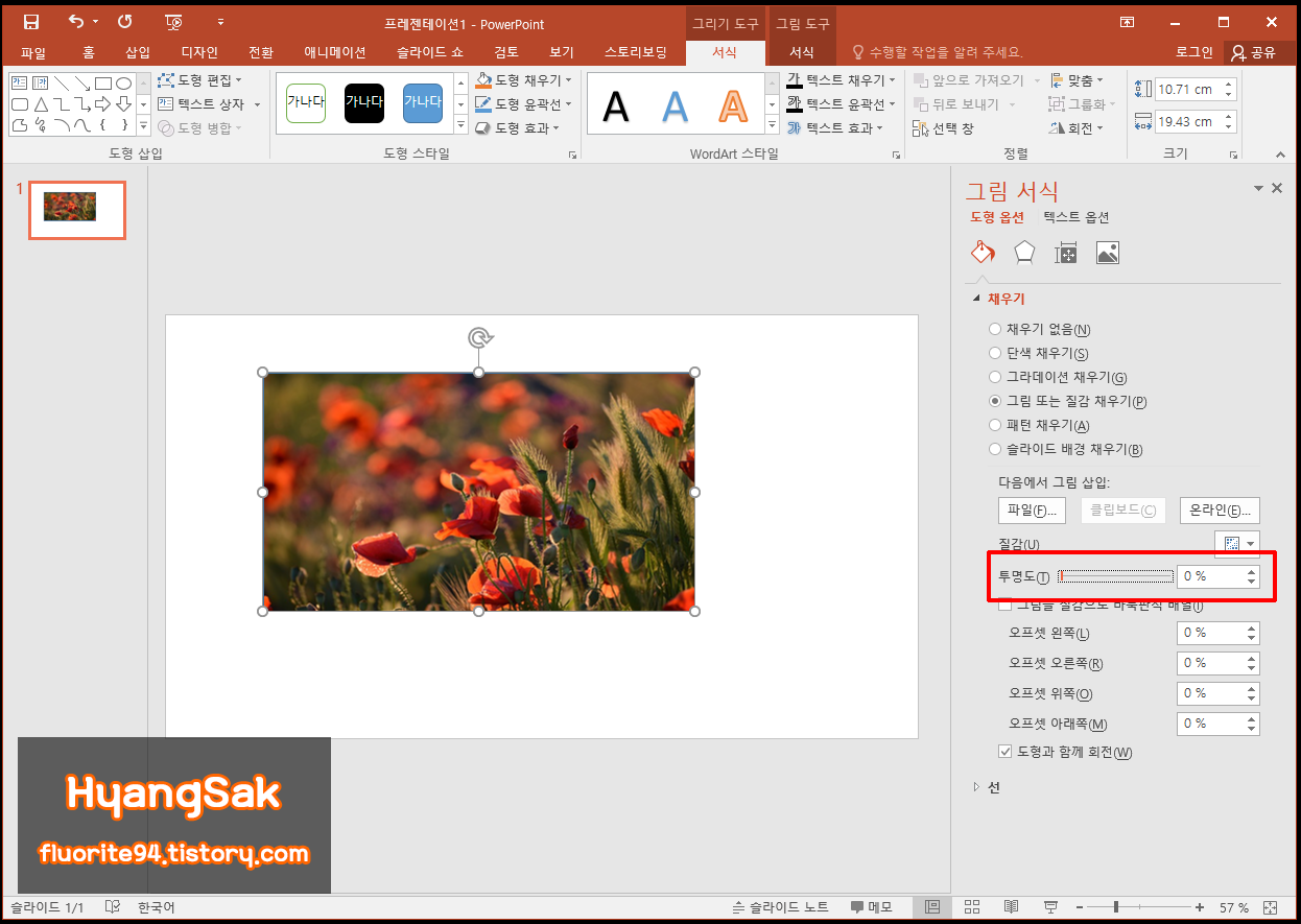 하지만 사진을 슬라이드에 넣게 되면 투명도 편집이 되지 않는데
