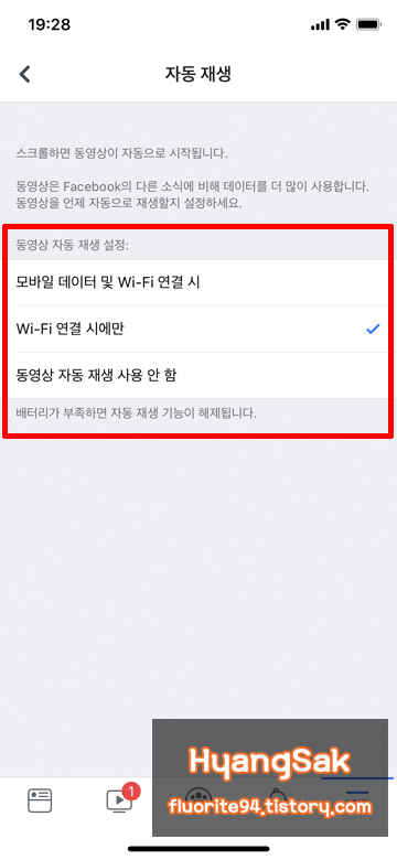 [동영상 자동 재생 설정]에서 Wi-Fi 연결 시에만 동영상이 재생되도록 설정합니다.