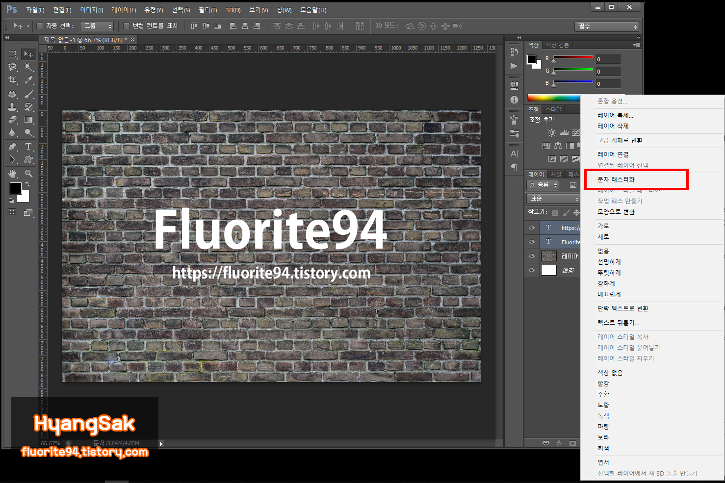 레이어 창에서 문자 레이어를 선택하고 우클릭하여 문자 레스터화를 누릅니다.