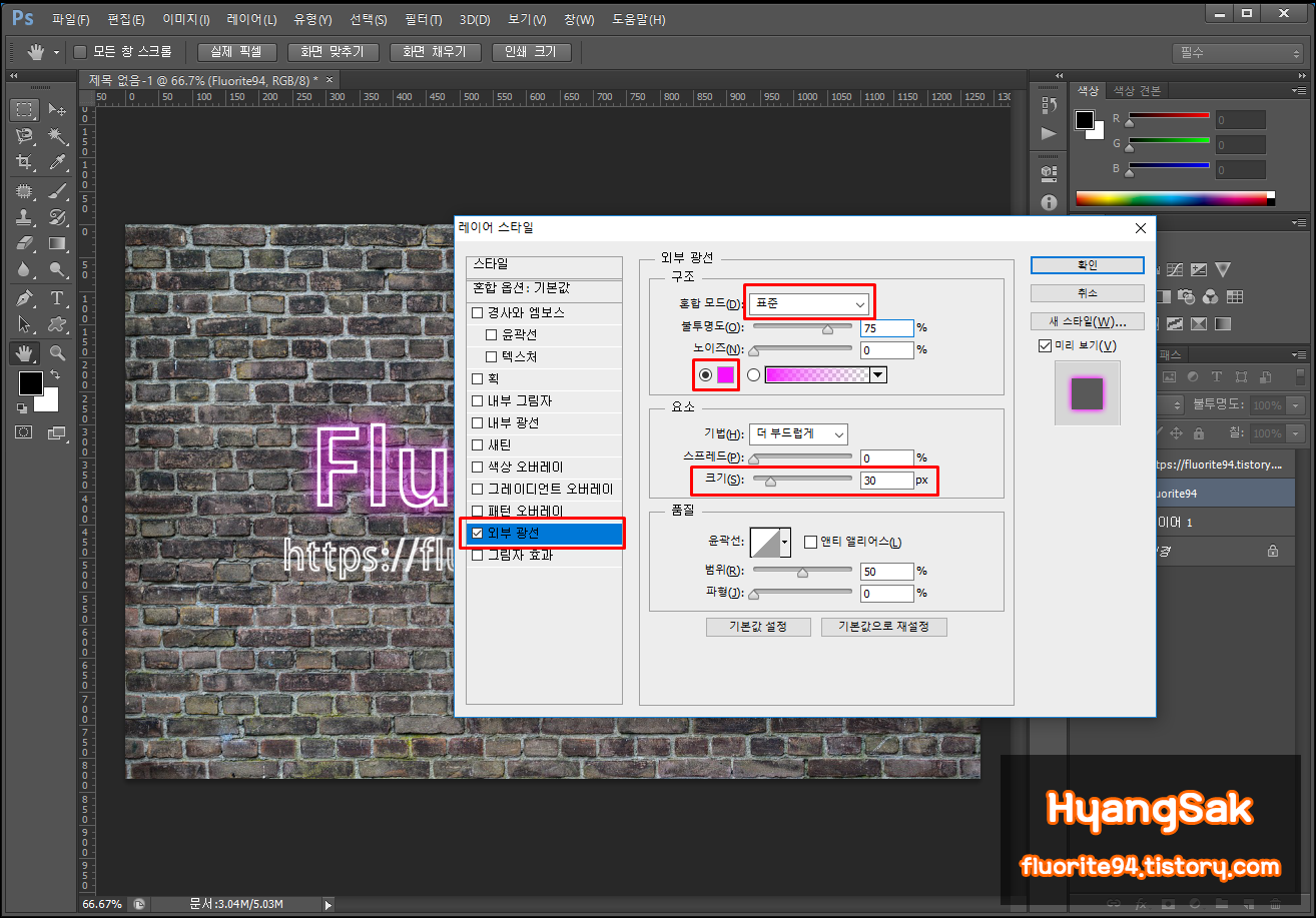 하단에 [레이어 스타일]을 클릭하여 외부 광선을 선택합니다.