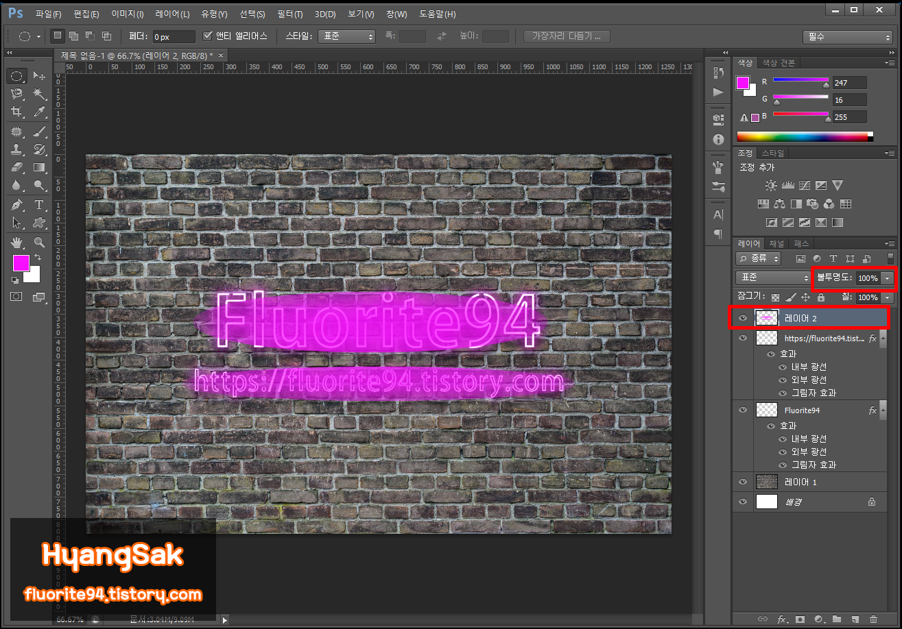 전경 색을 더블 클릭하여 네온 사인과 동일한 색을 선택하고 전경색 채우기(Alt + Delete)를 통해