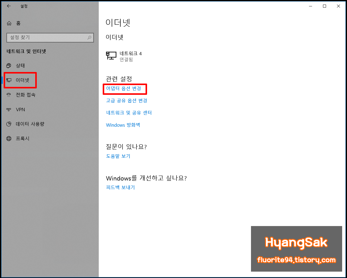 [이더넷 - 어댑터 옵션 변경]에 들어갑니다.
