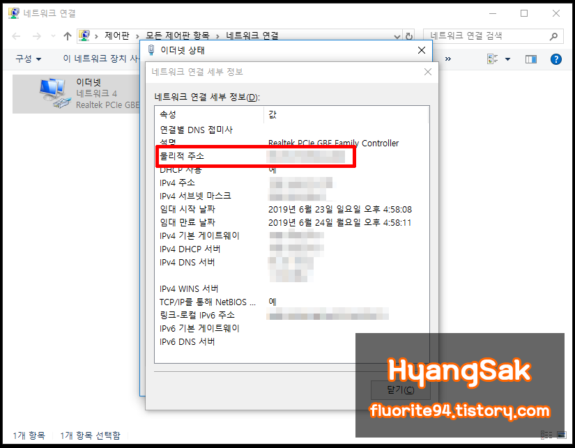 다음은 윈도우 설정중 네트워크 연결 세부 정보를 통하여 맥 주소를 확인하는 방법입니다.