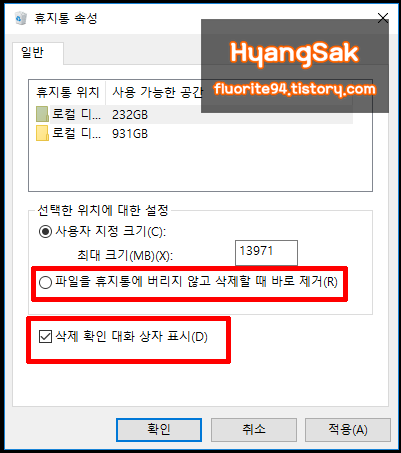 이 기능을 설정하게 되면 삭제할 때에 휴지통에 거치지 않고 파일을 바로 삭제할 수 있습니다.