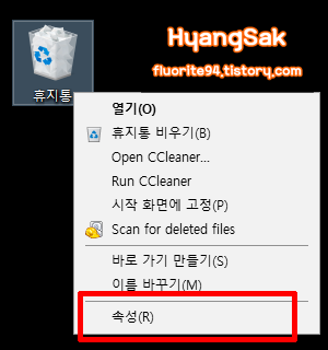 휴지통을 우클릭하여 속성에 들어갑니다.