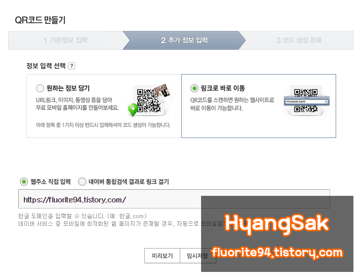 저는 제 블로그로 바로 가는 QR코드를 생성할 것이기 때문에 링크로 바로 이동을 선택합니다.