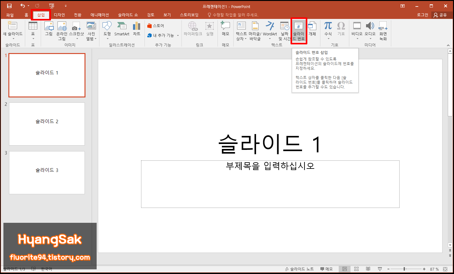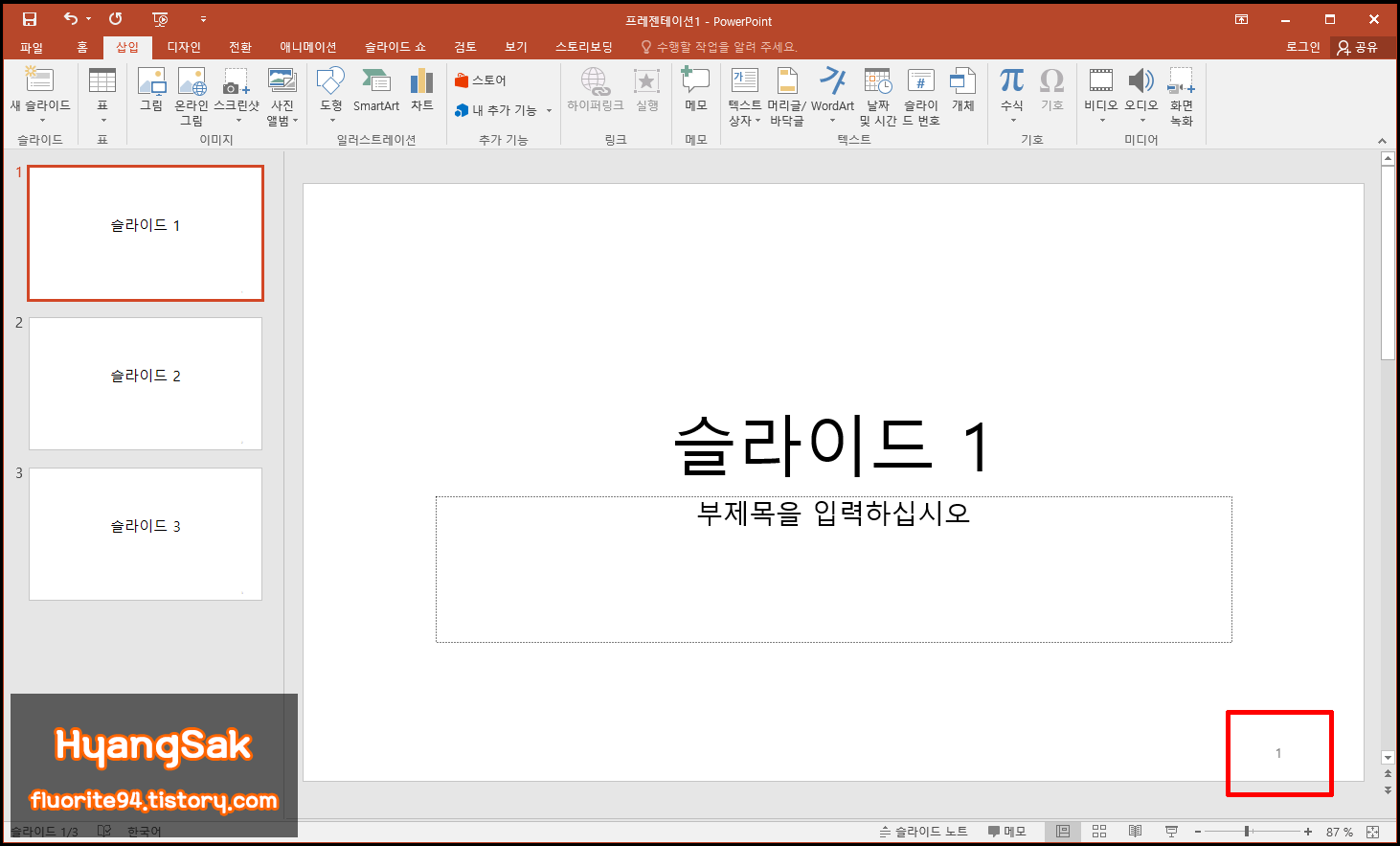 [삽입 - 슬라이드 번호]에 들어갑니다.