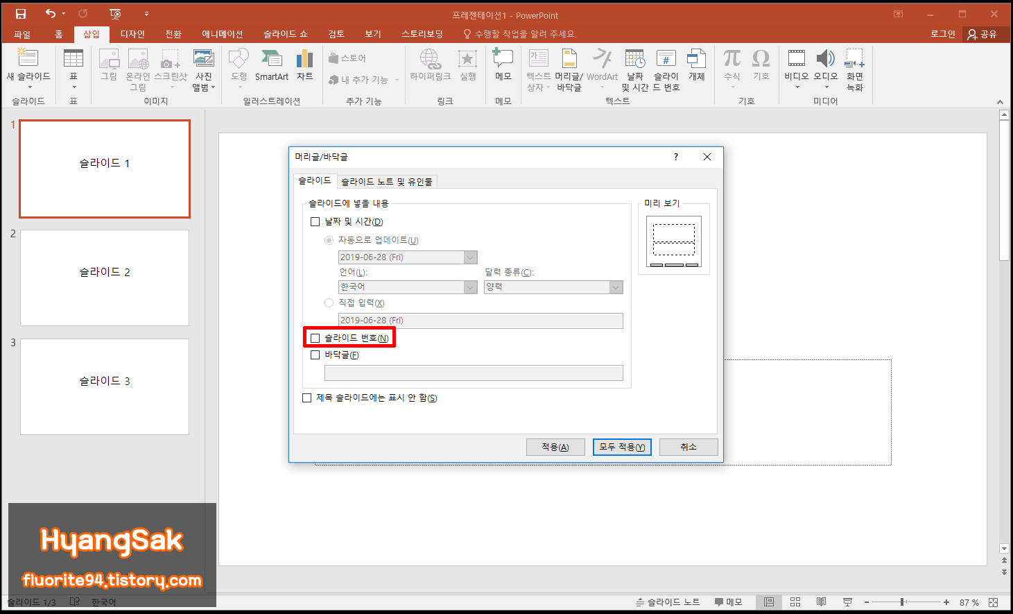 [슬라이드 번호]를 체크하고 적용을 누릅니다.