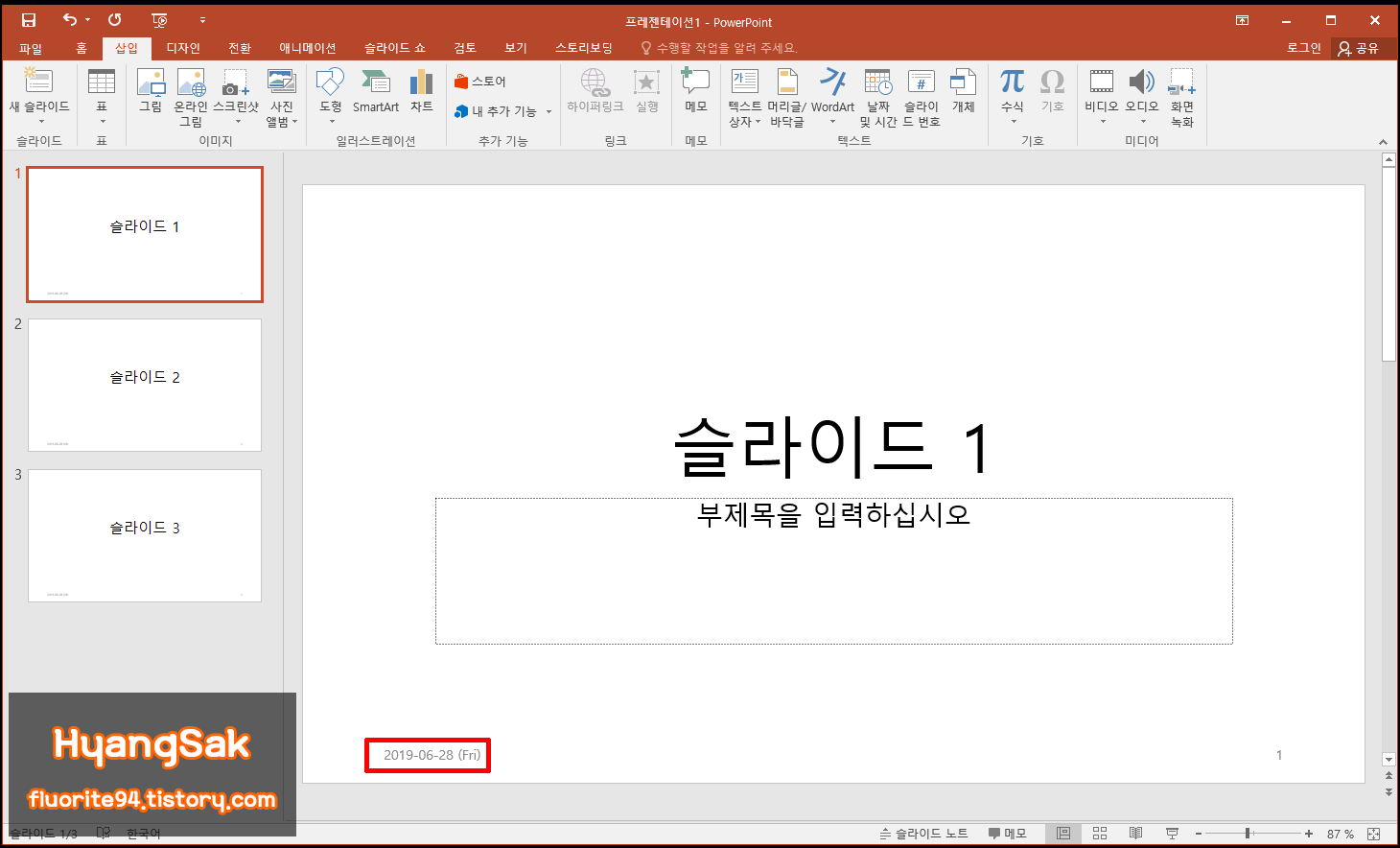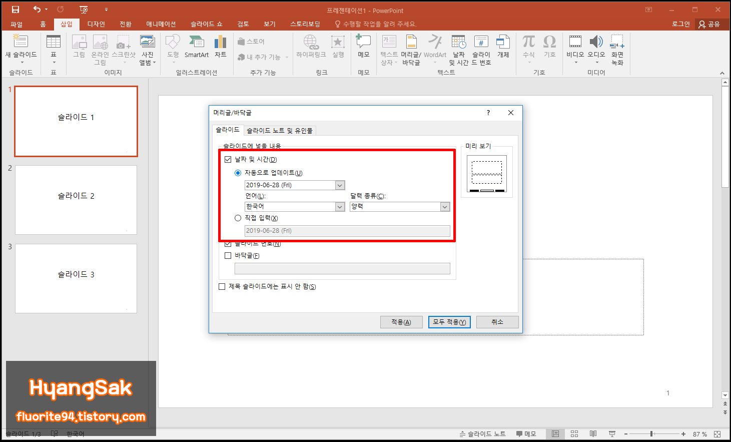 각 슬라이드에 번호 및 날짜를 넣는 방법입니다.