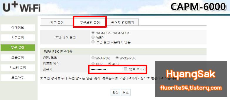 상단에 [무선보안 설정] 메뉴에 들어가면