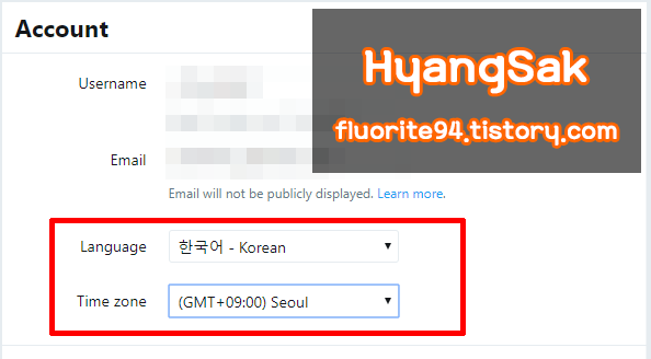 계정 정보에서 언어와 시간대를 원하는 언어, 시간대로 변경합니다.