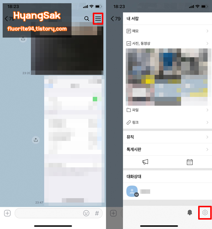 나와의 채팅방 우측 상단에 더보기를 클릭하여 창이 나타나면 하단에 설정에 들어갑니다.