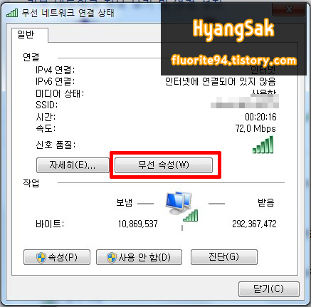 무선 네트워크 속성 창에서 상단에 [보안] 탭에 들어갑니다.