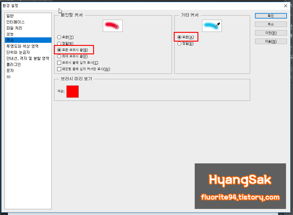 커서에 들어가서 [페인팅 커서], [기타 커서]를 [표준]으로 변경합니다.