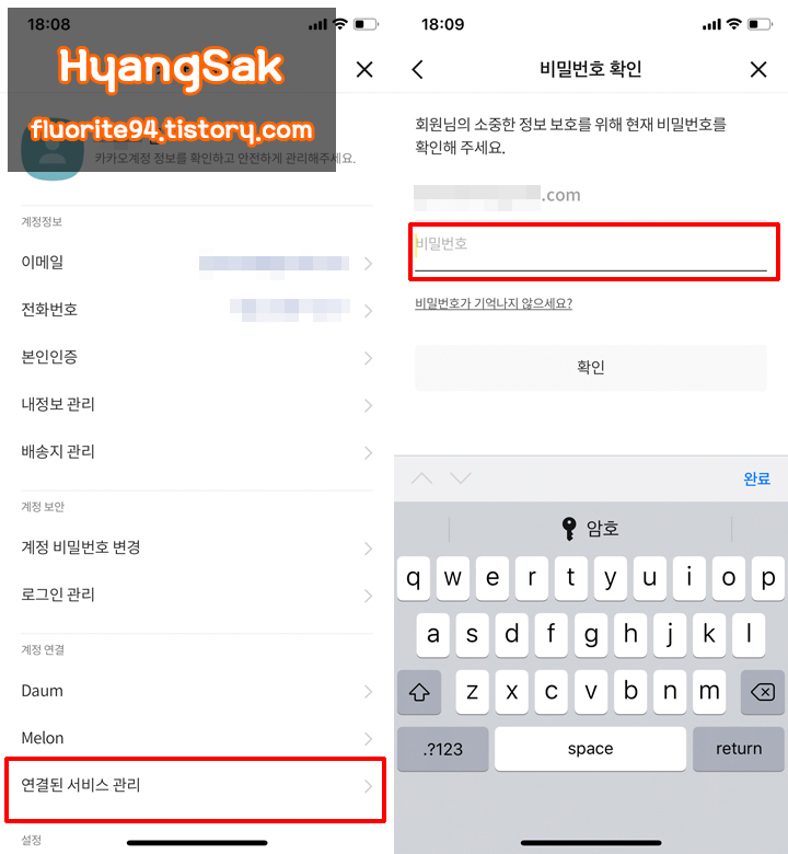 연결된 서비스 관리에 들어가 카카오 계정 암호를 입력합니다.