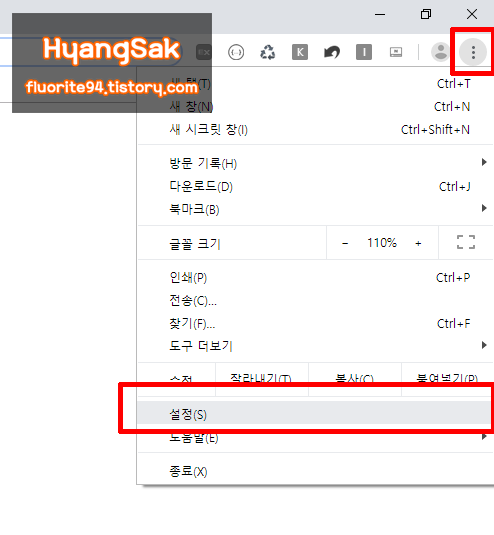 크롬 브라우저의 우측 상단에 [더보기]를 클릭하여 [설정]에 들어갑니다.