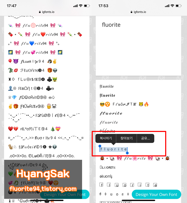 어플이나 웹을 이용하여 영문 글씨체를 복사하여 붙여 넣으면