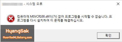 프로그램을 실행했을 때 [컴퓨터에 msvcr100.dll 파일이 없어서 프로그램을 시작할 수 없습니다.]라는 오류 메시지가 뜨면서 실행이 되지 않는 경우가 있습니다.