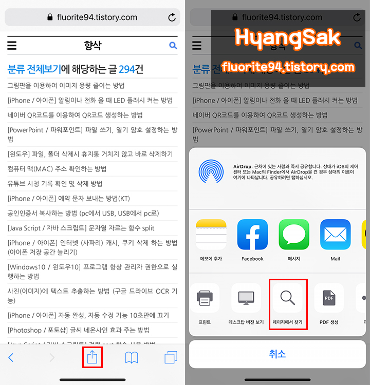 사파리 웹 브라우저 하단에 [공유] 버튼을 눌러 [페이지에서 찾기]를 클릭합니다.