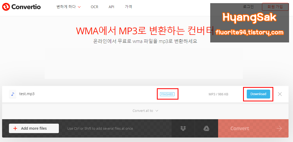변환이 완료되면 Finished라고 나타나며 변환이 끝난 항목을 다운로드 버튼을 이용하여 MP3 형식으로 다운로드할 수 있습니다.