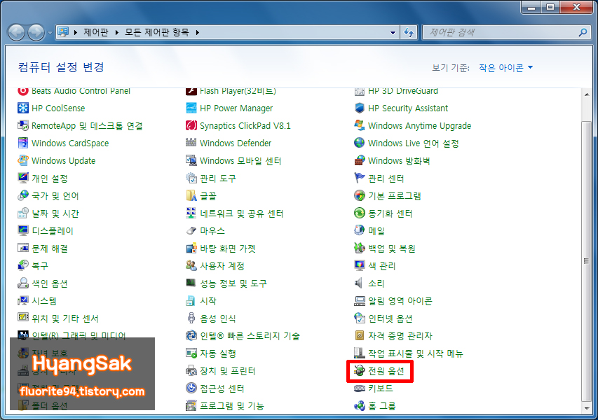 전원 옵션이 없으면 우측 상단에 [보기 기준]을 작은 아이콘으로 변경하면 전원 옵션 메뉴가 생성됩니다.