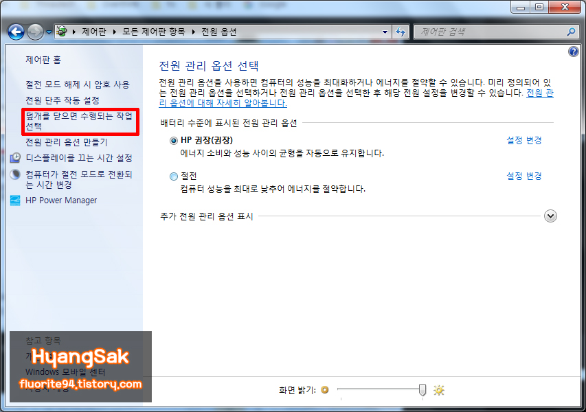 전원 옵션에서 좌측 메뉴에서 [덮개를 닫으면 수행되는 작업 선택]을 클릭합니다.