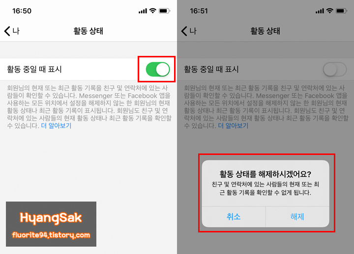활동 중일 때 표시를 끄게 되면 친구 및 연락처에 있는 사용자에게 내 활동 기록을 보여주지 않게 됩니다.