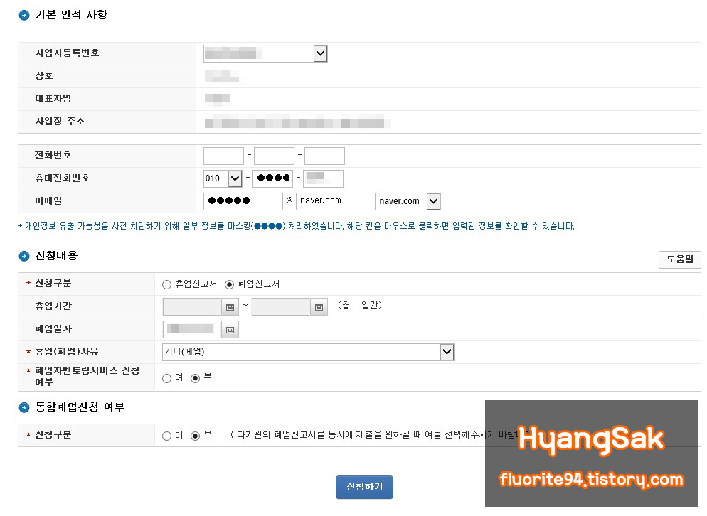 인적 사항을 확인한 다음 아래의 신청 내용에서 휴업, 폐업을 선택한 다음 내용을 입력하시면 됩니다.