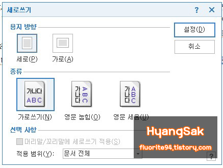 세로 쓰기에 들어오면 용지 방향, 쓰기 종류, 적용 범위 등을 설정할 수 있습니다. 원하는 설정으로 설정하시면 됩니다.