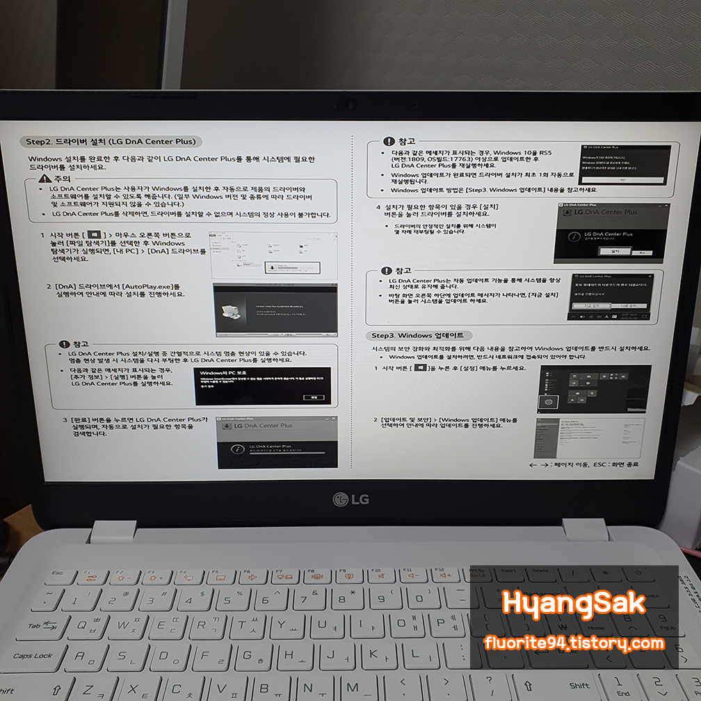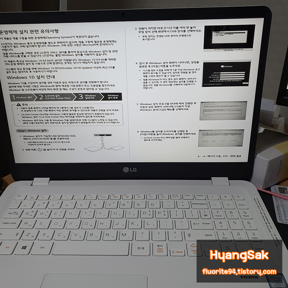 LG 그램 FREE DOS 제품을 구매하여 처음 부팅하면 위와 같이 운영체제 설치에 관한 유의사항과 OS 설치 방법, 드라이버 설치 방법 등이 나타납니다.