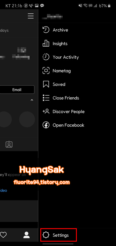 우측 상단에 [더보기]를 클릭한 다음 아래 [Settings]에 들어갑니다.