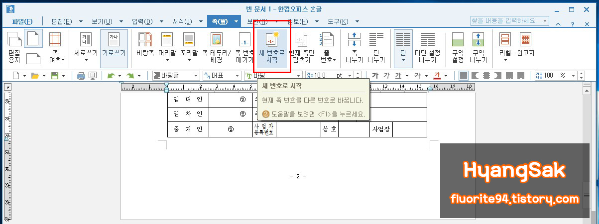 만약 내용을 이어서 새로 작성한 한글 파일에서 쪽 번호를 매겨야 한다면 1이 아닌 페이지 마지막부터 이어서 쪽 번호를 매겨야 합니다. 이런 경우 [쪽] 탭에서 [새 번호로 시작]을 클릭하시면 됩니다.