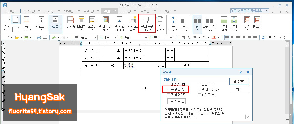 쪽 번호를 지우고 뽑아야 하는 페이지라면 [현재 쪽만 감추기]를 클릭한 다음 설정 창에서 [쪽 번호]를 체크한 다음 설정해주면 해당 쪽만 쪽 번호를 감출 수 있습니다.