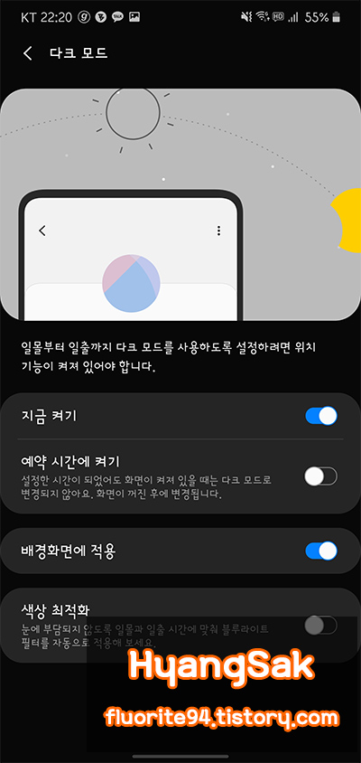 디스플레이 설정에서 다크 모드를 on / off 할 수 있습니다. 다크 모드를 설정하고 사용 중 부분을 클릭하면 상세 설정으로 들어갈 수 있습니다.