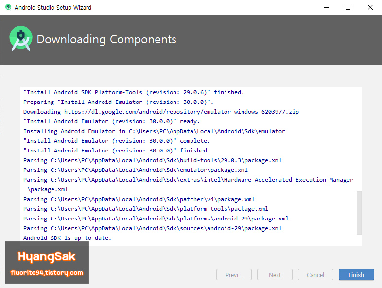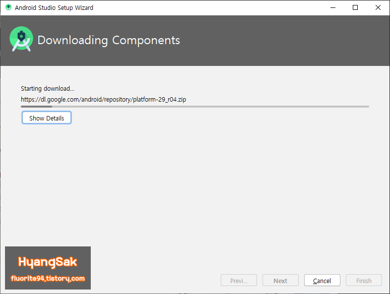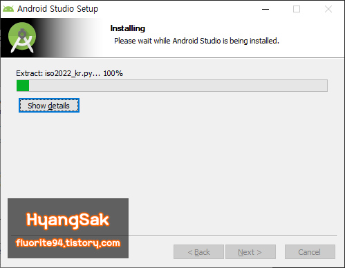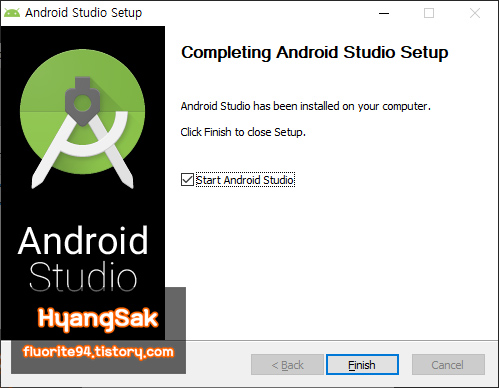 설치가 완료되면 Start Android Studio 체크 박스를 선택하고 Finish를 클릭합니다.