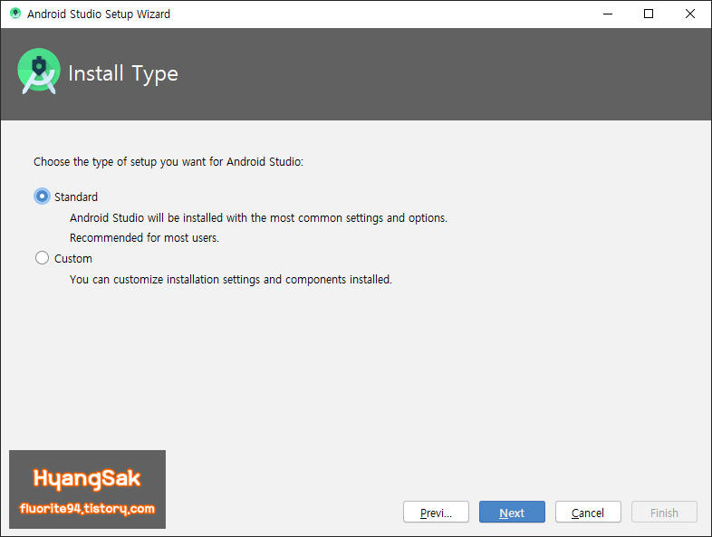 안드로이드 스튜디오에서 추천하는 표준 방식으로 설정할 것인지 개발자 맞춤 방식으로 설정할 것인지 선택합니다.