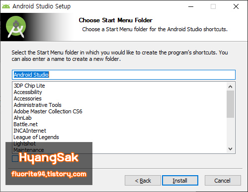 설치할 경로와 시작 메뉴에 표시될 폴더 이름을 입력하고 Install을 클릭합니다.