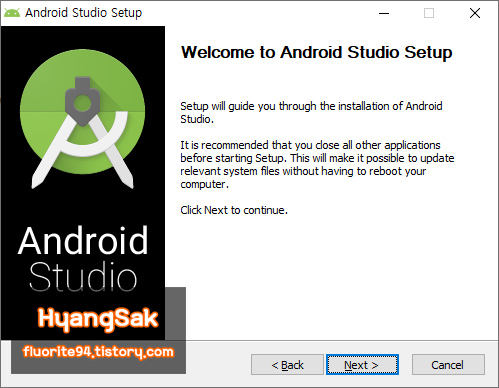 설치된 안드로이드 스튜디오를 실행하면 개발 환경 설정 마법사가 실행됩니다.