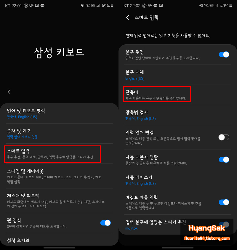 키보드 설정에서 [스마트 입력 - 단축어]에 들어갑니다.