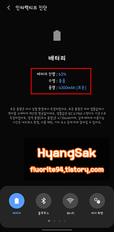 배터리 수명과 용량이 나옵니다. 여기서 수명이 좋음이 아닌 나쁨으로 나온다면 서비스 센터에 방문하여 배터리를 교체하거나 상담해보는 것을 추천드립니다. 삼성 멤버스 앱의 인터렉티브 진단을 이용하면 배터리의 상태를 볼 수 있을 뿐만 아니라 각 하드웨어의 성능들을 체크할 수 있으니 한번 진단을 해보시는 것도 괜찮은 것 같습니다 :)