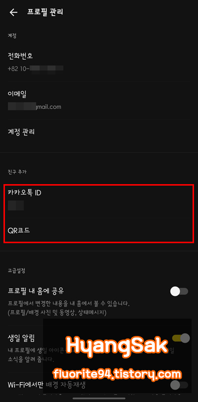 여기서 내 카카오톡 ID를 확인할 수 있고 QR코드를 생성하여 QR코드를 전달할 수도 있습니다.