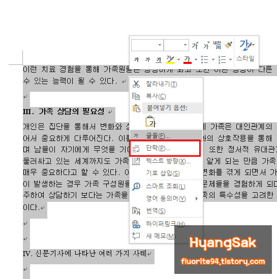 원하는 부분을 드래그한 다음 우클릭하여 [단락]에 들어갑니다.
