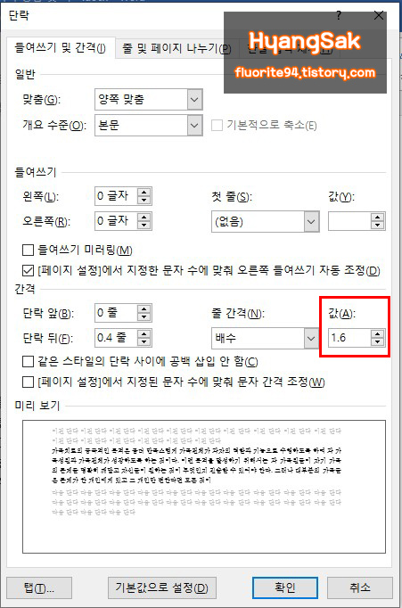 단락 옵션에 들어오면 [값]이 있습니다. 여기서 1.6을 입력하면 줄 간격이 160, 1.8을 입력하면 180이 됩니다.