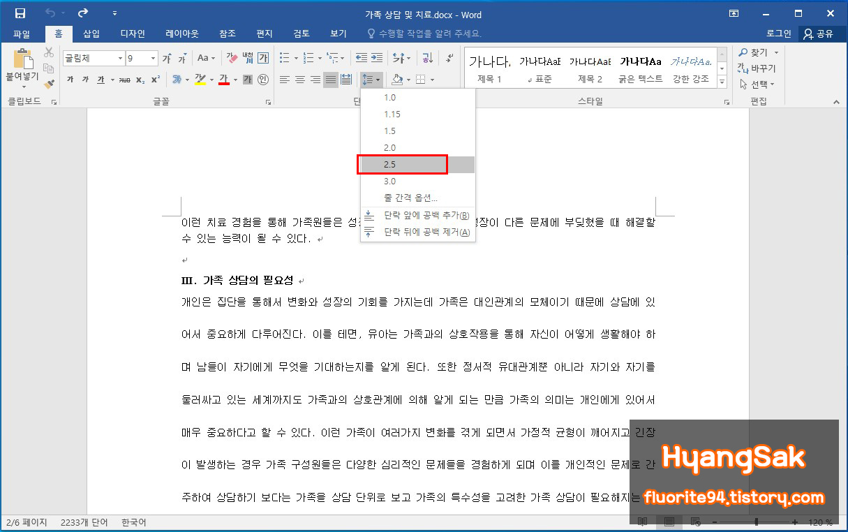 이렇게 2.5를 선택하면 줄 간격이 250으로 변경된 것을 볼 수 있습니다.