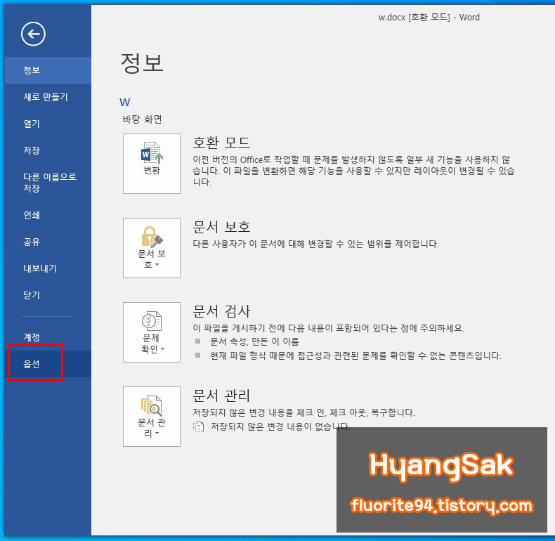 [옵션]을 눌러 Word 옵션에 들어갑니다.
