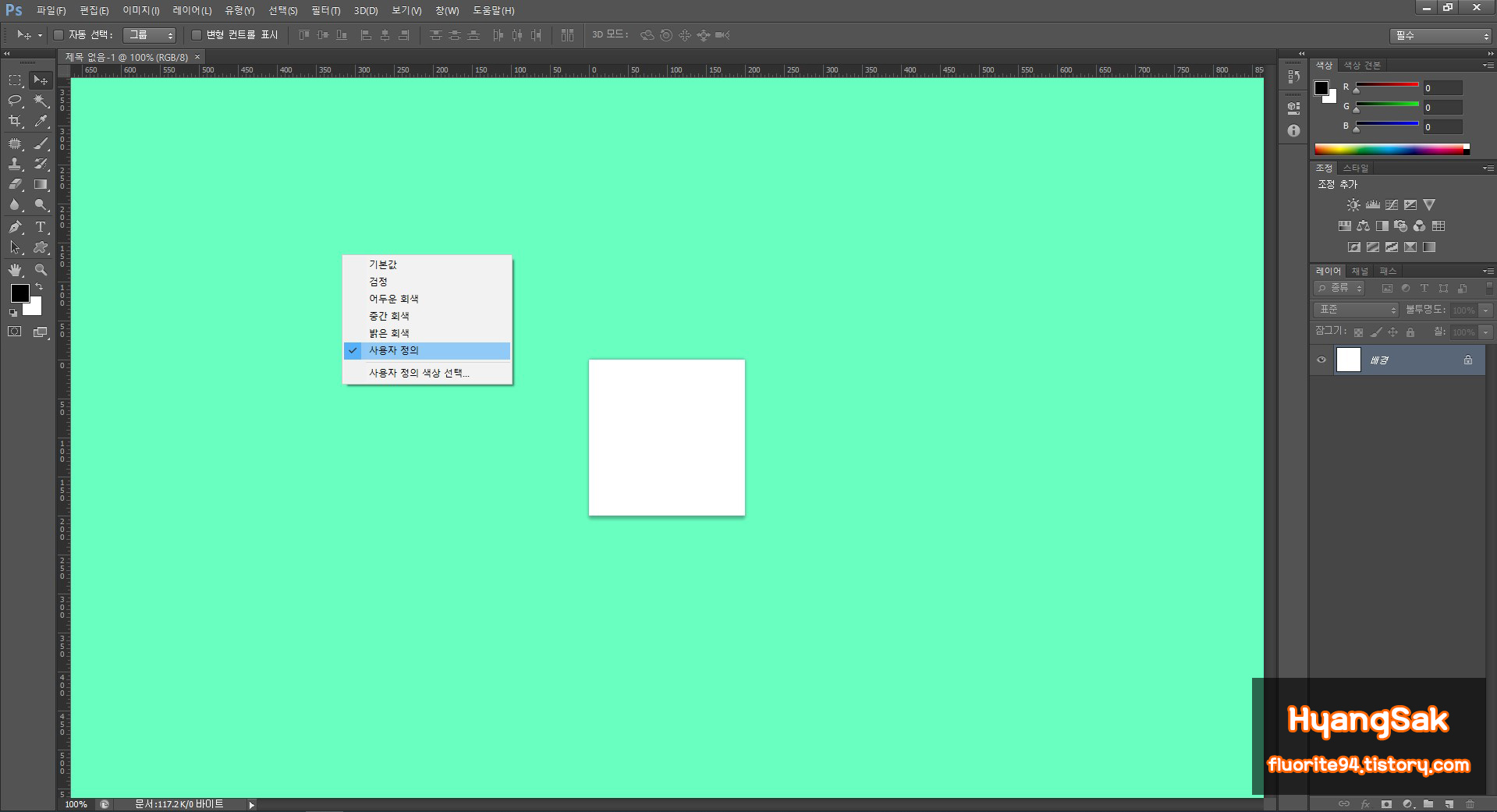 빈 캔버스를 우클릭하여 지정된 컬러로 변경하거나 사용자 정의 색상 선택에 들어가서 원하는 색상으로도 설정 가능합니다.